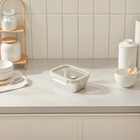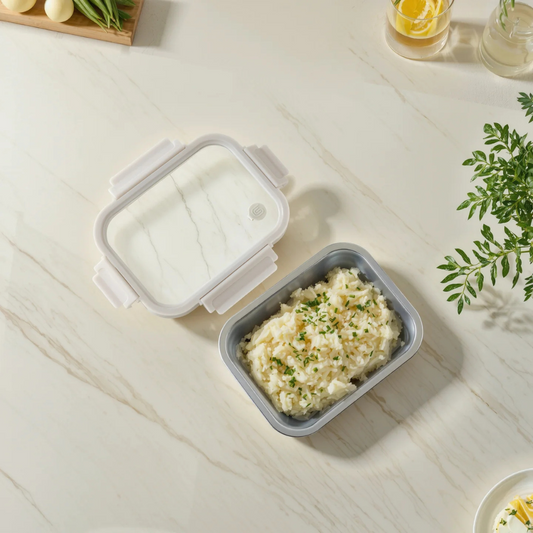 Vanilla Rect. Microwave Safe S/S Container With Vented Glass Lid - 27oz