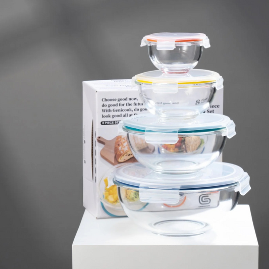 Nesting Glass Mixing Bowl Set With Locking Lids and Carry Handle - 8 pc Set