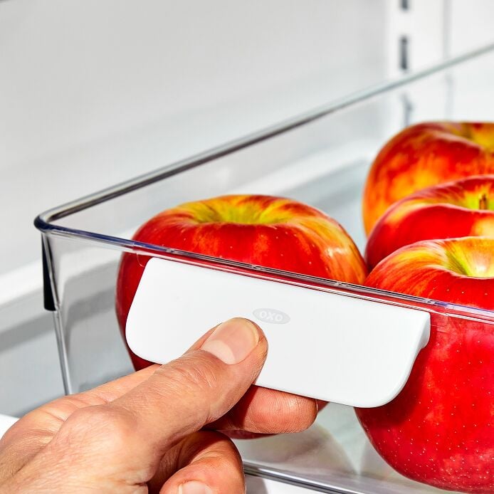 Organize the contents of your fridge to cut down on clutter and prevent food waste. The OXO Good Grips Fridge Organization System features a combination of bins, drawers, shelves, and risers, to help streamline your refrigerator. Our 4-Piece Refrigerator Storage Bin Start Set has everything you need to keep produce, beverage, condiments and more, tidy and in view. Included in the set are four clear, space-saving Bins, in two different sizes designed to create a customized, modular system for your fridge. The rounded handles provide a comfortable grip, especially helpful while prepping a recipe or for little hands grabbing a snack. A smooth base allows the Bins to glide easily so you can keep an eye on food expiration dates. The.75 in x 14.8 in x 3 in Bins are perfect for yogurt cups, berry bins and small produce, while the 8 in x 14.8 in x 3 in Bins are sized to hold cheese, deli or packaged meat and fish.