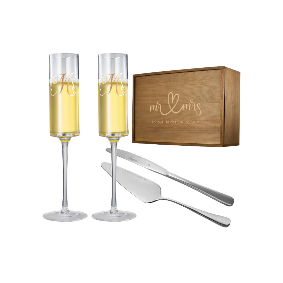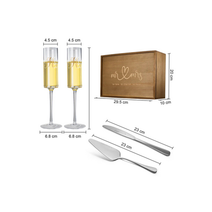 - The Bridal Mr & Mrs Champagne Flute Gift Set is an exquisite collection designed to celebrate love and special moments. This set includes two elegantly crafted champagne flutes, each engraved with "Mr" and "Mrs" in beautiful script. These flutes are perfect for toasting during weddings, bridal showers, and anniversaries, adding a touch of sophistication and sentimentality to the occasion. The clear, high-quality glass ensures that the champagne sparkles, making each toast memorable.