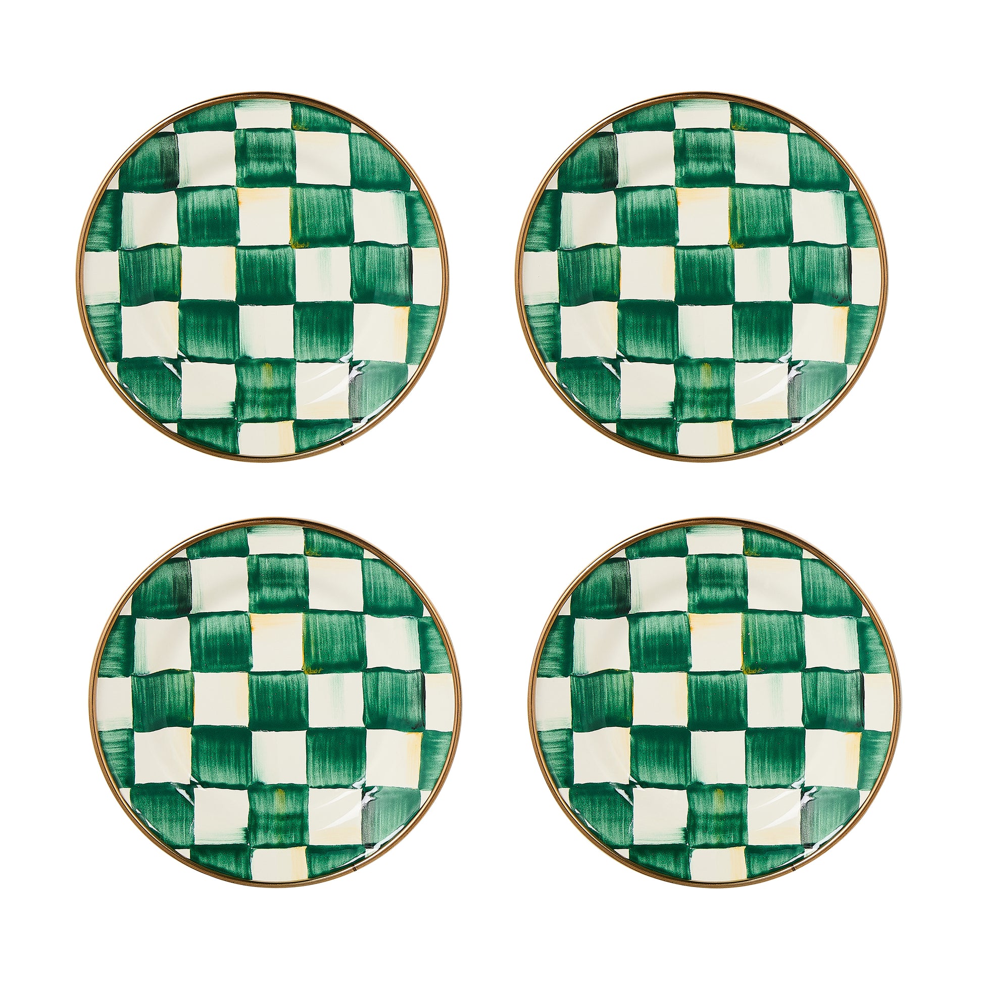 Tapas? Noshes? Tasty treats? The slightly smaller silhouette of the set of four Emerald Check® Enamel Appetizer Plates offers the warm, inviting high-contrast gloss of our most popular pattern. The comfort food of dinnerware, our most popular pattern is casual and cozy, with a subtle jewel-tone palette woven by an artisan’s brush through the glossy, hand-painted checks.