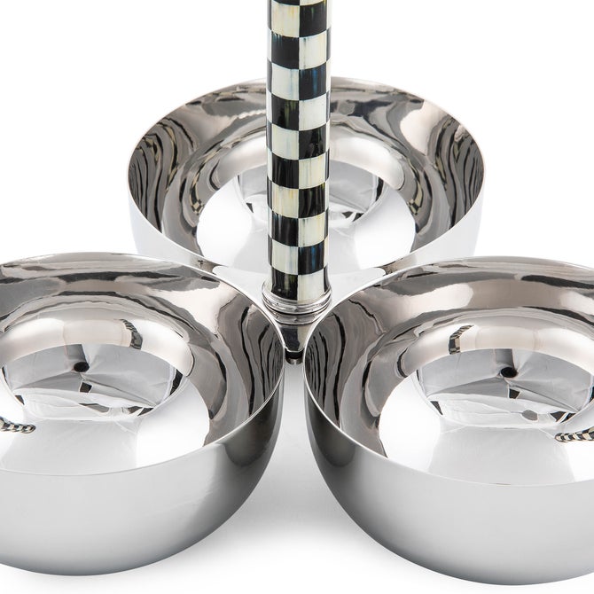 Make a playful presentation of garnishes, candies or bar snacks with the Courtly Check® Supper Club Trio. It features three stainless-steel cups attached to a central handle that’s decorated with an enameled coating of our Courtly Check pattern.