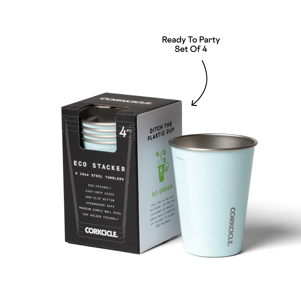 The party just got cooler - and a lot better for mother earth. The Corkcicle Eco Stacker 4-pack is your stainless, stylish, and sustainable replacement for the everyday plastic, single-use party cup. This reusable cold beverage solution is made from 18/8 stainless-steel, features our signature easy-grip and non-slip silicone bottom, and is dishwasher safe making dreaded party clean up a breeze. The Eco Stacker 4-pack elevates every poolside celebration, backyard party, tailgate and is a step in the right direction in eliminating plastic waste.
