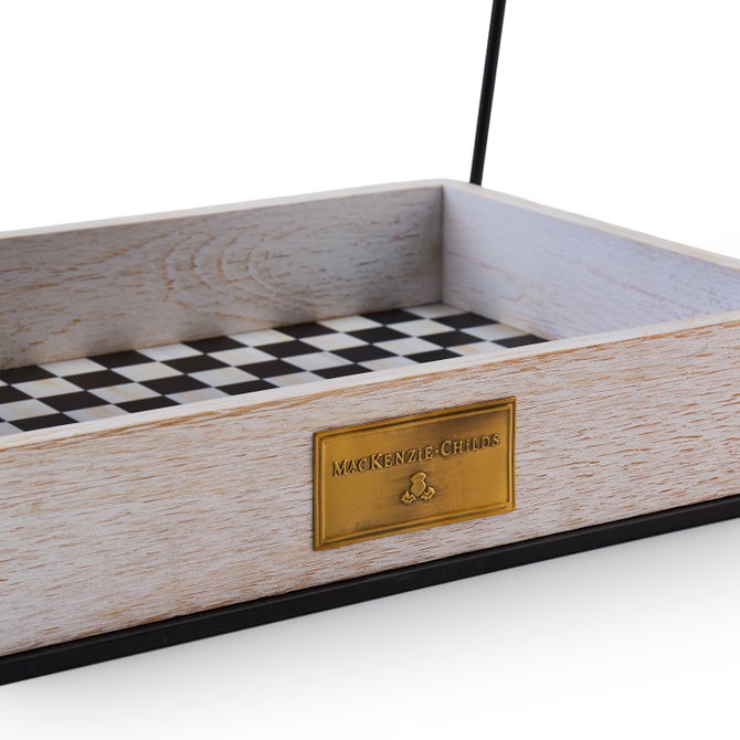 You can never have too much storage in the kitchen, especially when it’s as delightful as this tiered stand with two wire baskets and a wooden tray, all accented with hand-applied Courtly Check® decoration.