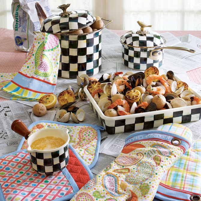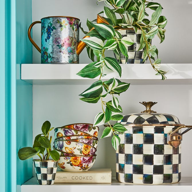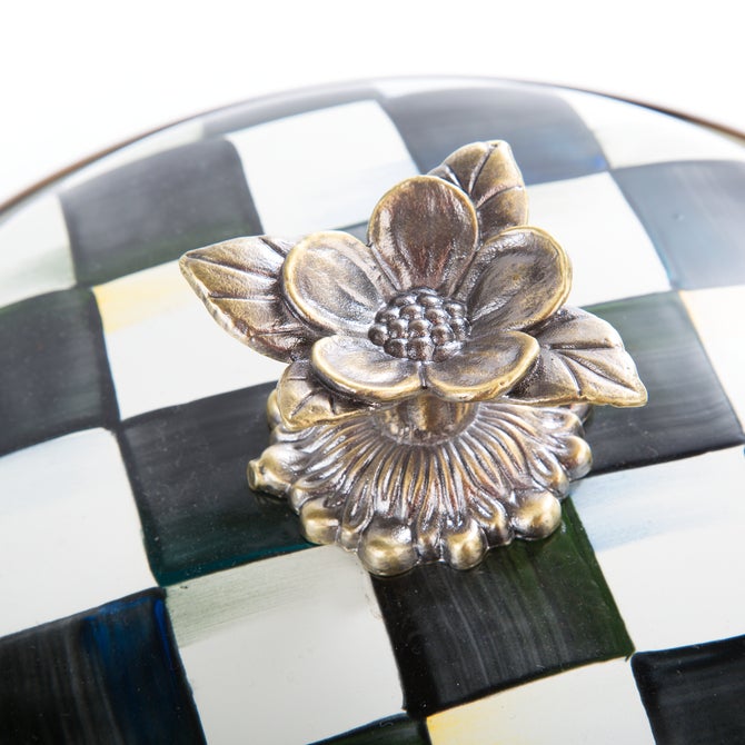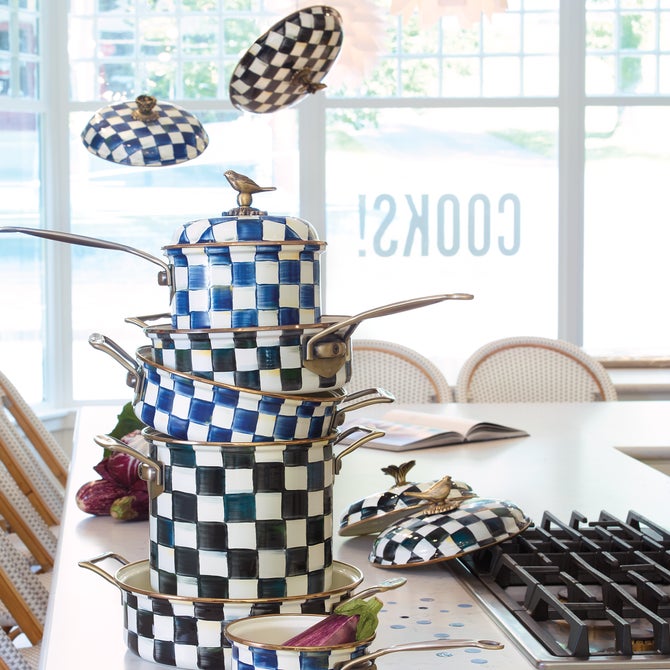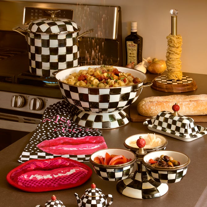 From stovetop to tabletop, our Courtly Check® Enamel 7 Qt. Stockpot transitions with more than a dash of panache. A core part of The Entertaining Kitchen™, imagine how your signature soups and stews will stand out when served up in a dish bedecked with our signature black and white pattern. And to top it all off, a blossoming bud sprouts up to serve as a knob, as unique as it is useful.