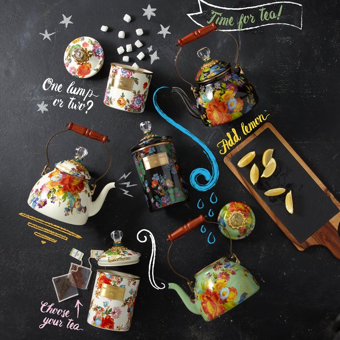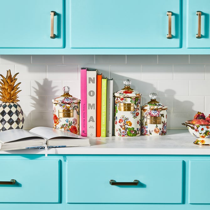 Flour, sugar, and coffee might seem the most obvious of contents with which to fill a set of three Flower Market Canisters, but the possibilities are endless! Keep them in the kitchen with coffee beans and tea bags, cookies and candies, or dog biscuits and birdseed-or invent new uses around the house. Perfect for cotton balls and swabs in the bathroom, pens and pencils in the office, or knickknacks and doodads in the kids’ room. Color glazed in black, green or white, each Flower Market Enamel Canister is decorated with hand-applied fanciful botanical transfers that recall a lush English garden in the peak of summer. These canisters stand handsomely alone or harmonize delightfully in a multicolor set.