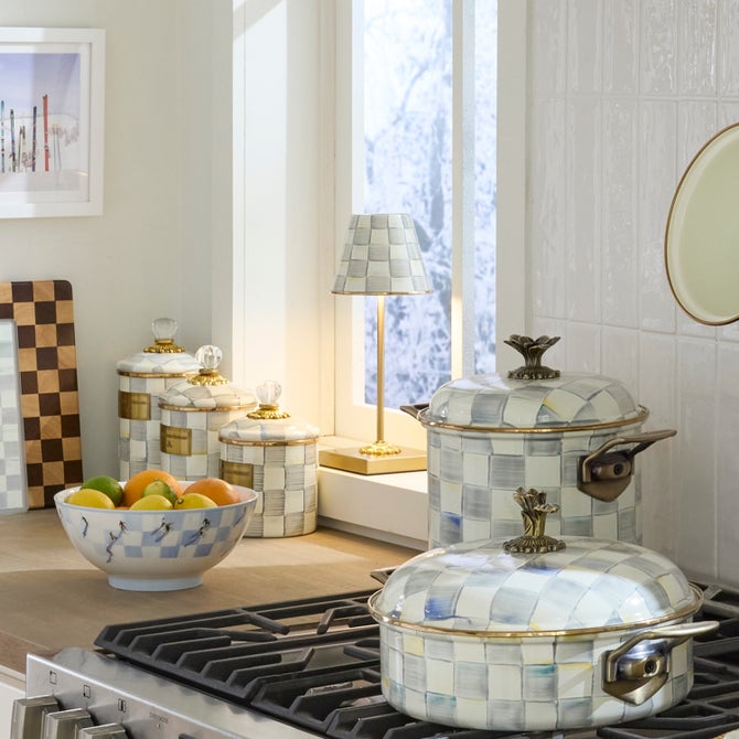 The Sterling Check® LED Rechargeable Cafe Table Lamp is the little light that shines big without the inconvenience of cords. Featuring our grey check pattern on a brass-finish base, it illuminates for up to three hours and recharges with a 5-watt USB cable (included). It operates with ease by tapping the shade on the top, and there are three settings for brightness.