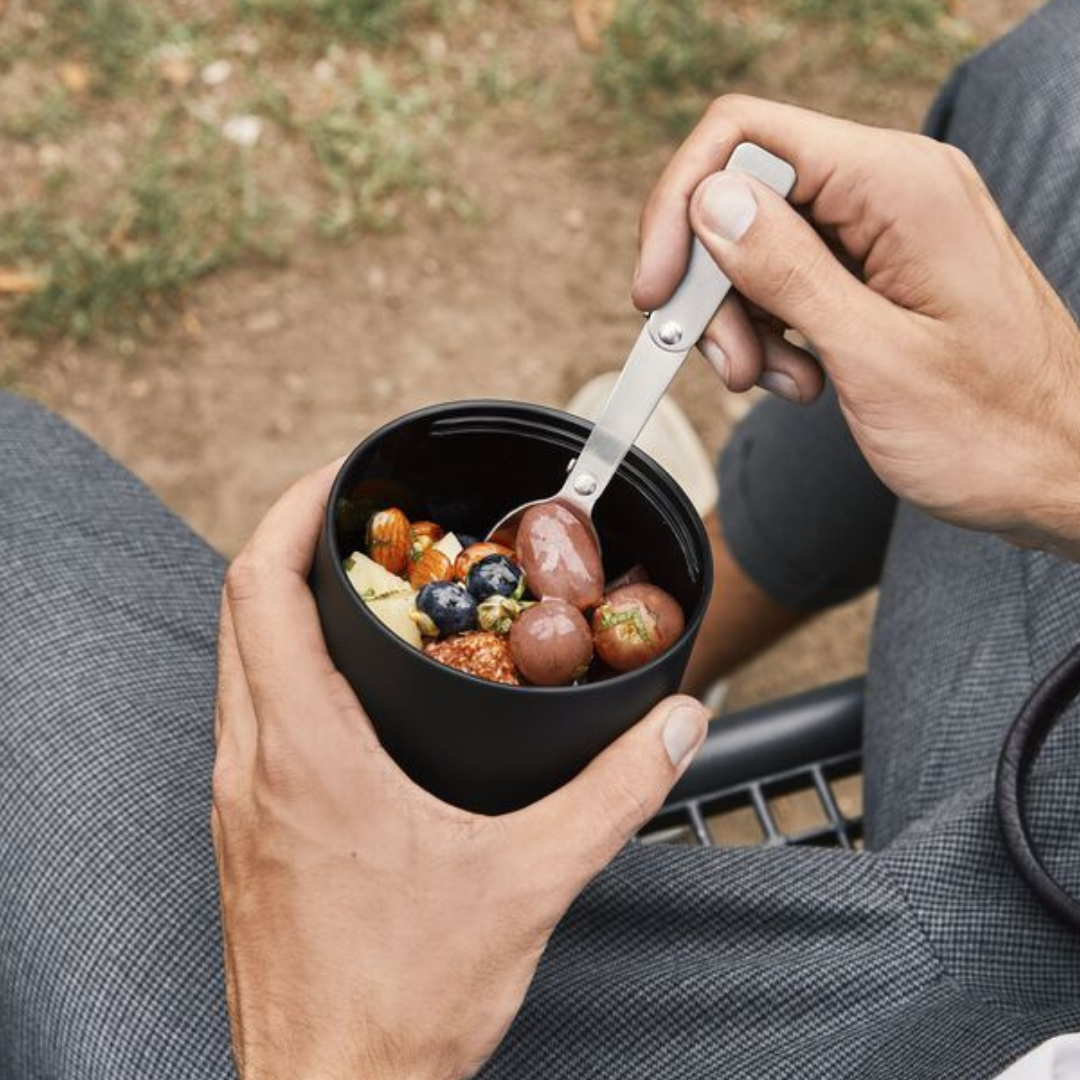 The Thermo Food Jar is perfect for soups, pastas, fruits, salads, and more when you want to bring your meal with you. Hot food stays hot for up to 8 hours and cold food stays cold for up to 11 hours. The lid doubles as a bowl and features a foldable metal spoon. Available in silver-white and black matte, this attractive jar is a stylish way to take food on the go.