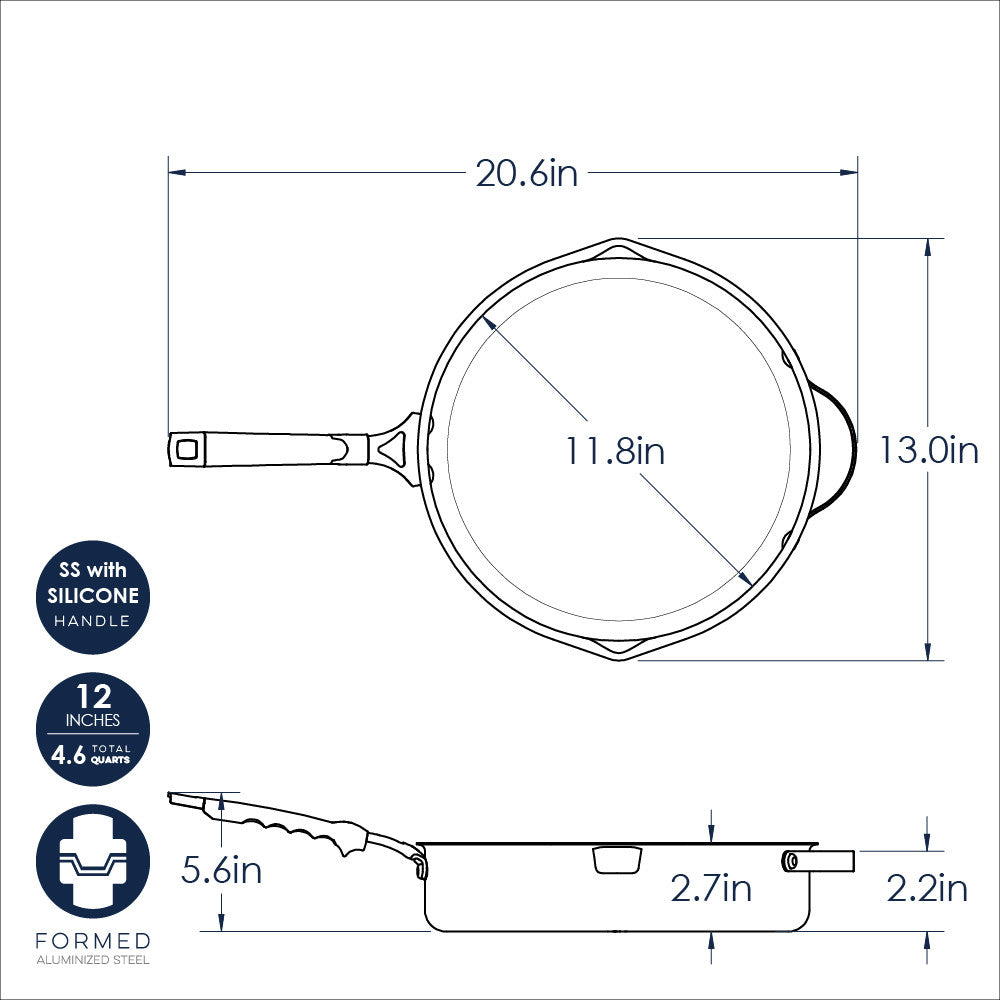 This skillet is designed with two stainless handles, securely fastened with rivets featuring stay-cool silicone grips. Additionally, it has a handy helper handle for easy carrying and maneuvering. Our cookware is made with a pour spout and high sides that offer maximum capacity and convenience. You can pour liquids and sauce, without worrying about any spills. The high sides also ensure that your food stays inside the cookware while cooking, preventing any mess on your stovetop.